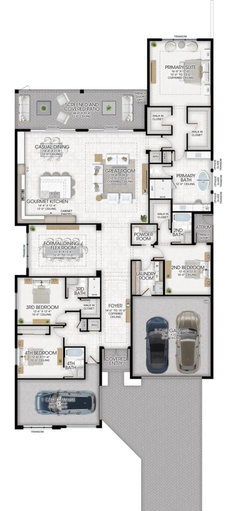 It has 4 Bedrooms, 4.5 Bathrooms, a formal dining/flex room, a Great Room, a Screened and Covered Patio, and a 3-Car Garage.