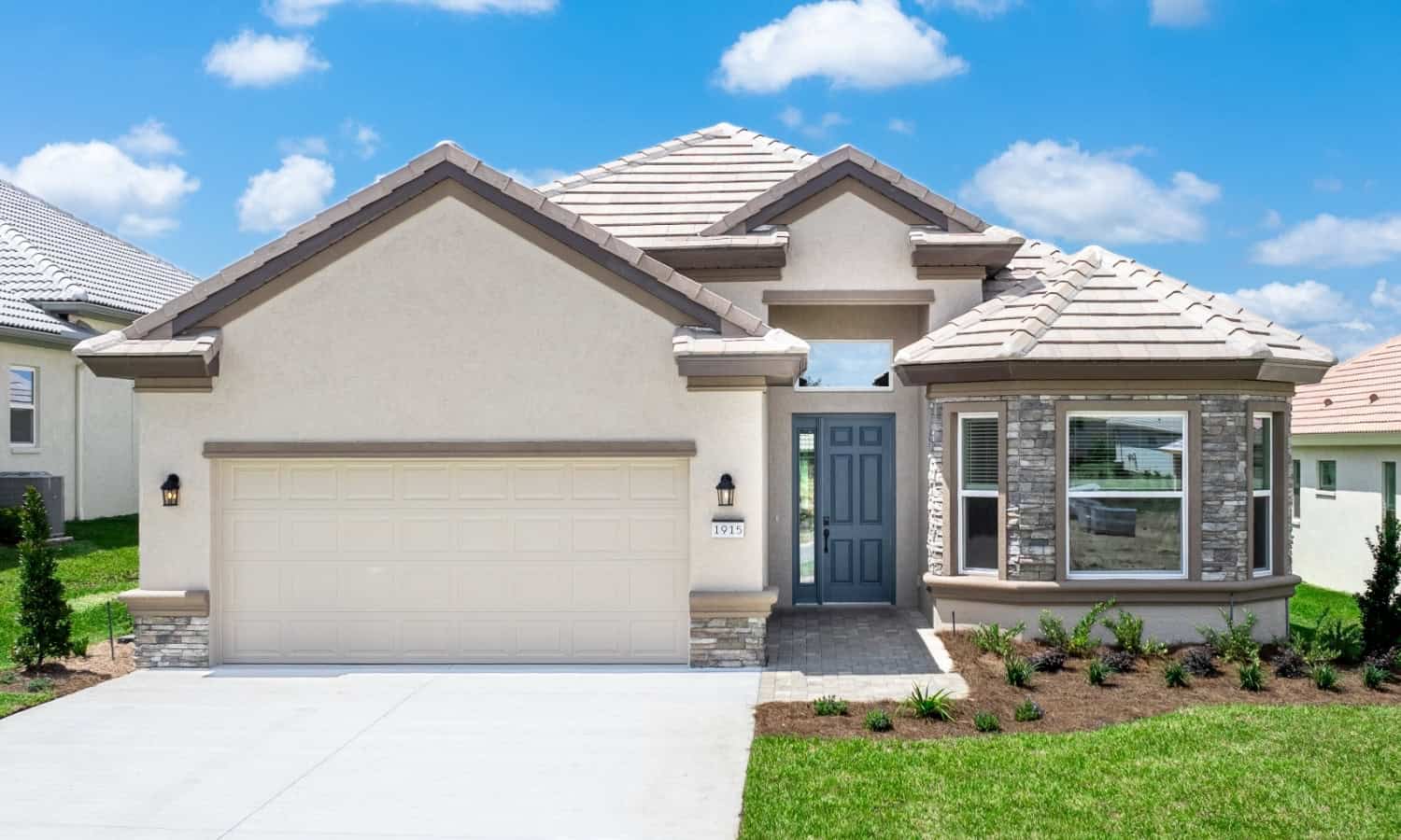 The main entrance to the St. Christopher is right between the two-car garage and guest bedroom.