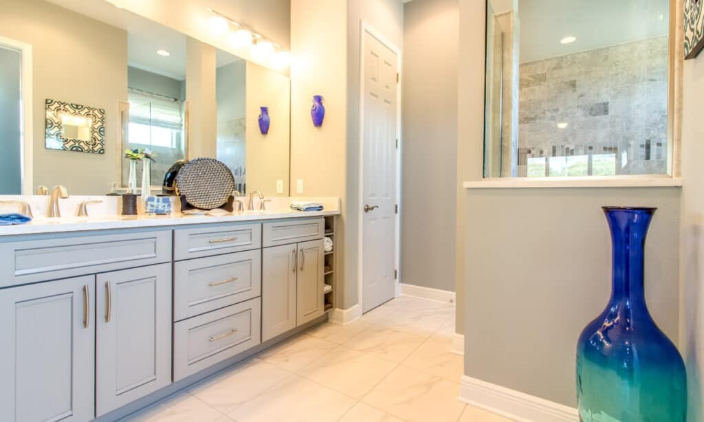 Making your way through the master suite, you will find a short hallway with his and hers closets on either side that leads right into the master bathroom.